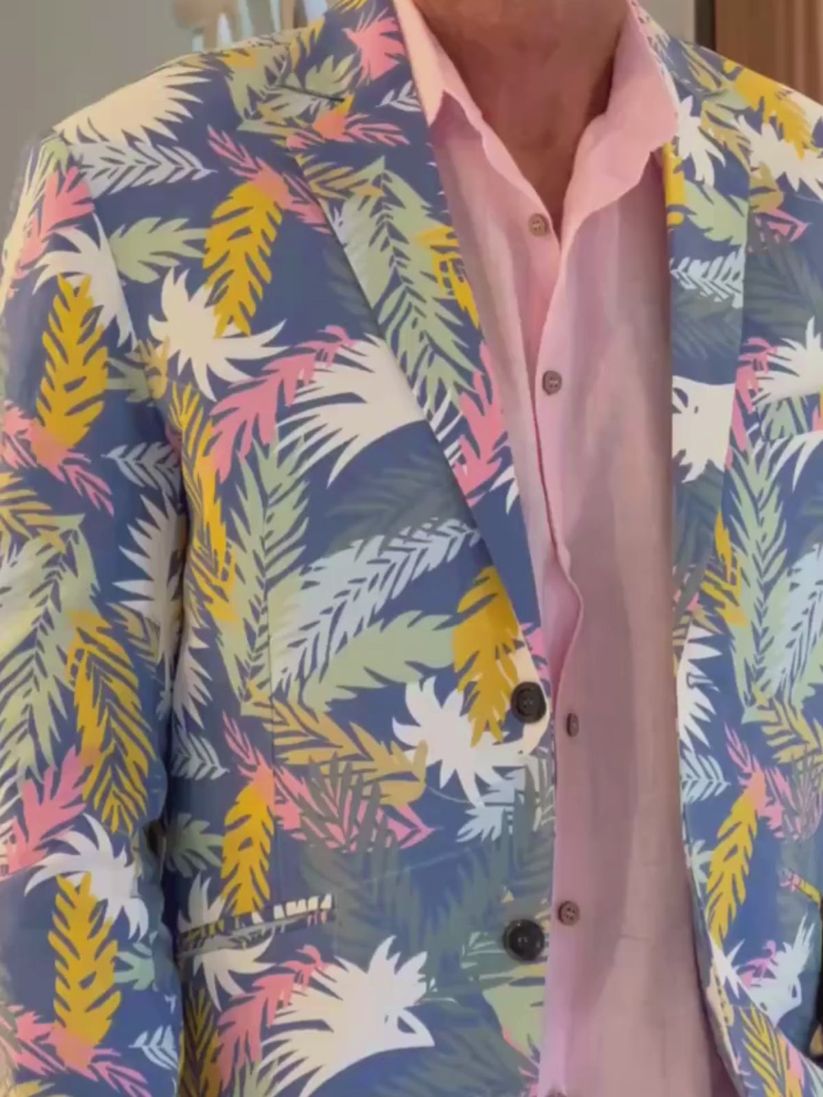 Embrace effortless tropical style with this bold cotton jacket. Featuring a deep blue base adorned with a vibrant palm print in yellow, white, and pink,