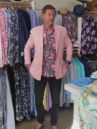 A structured jacket in a subtle pink coloured linen, fully lined with inside pocketing, buttons and linings may vary.