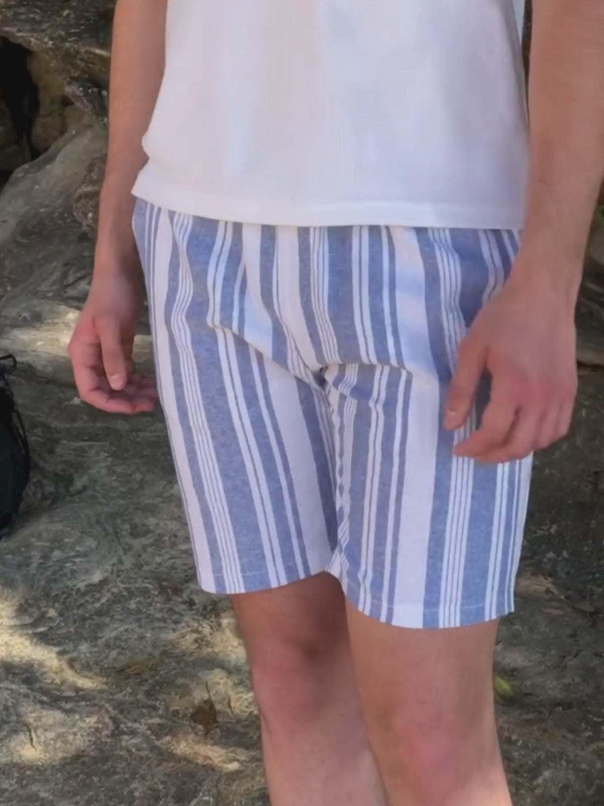 Australian Made Linen Unisex Short, with two side pockets, back pocket, drawstring cord, and fake fly front.
