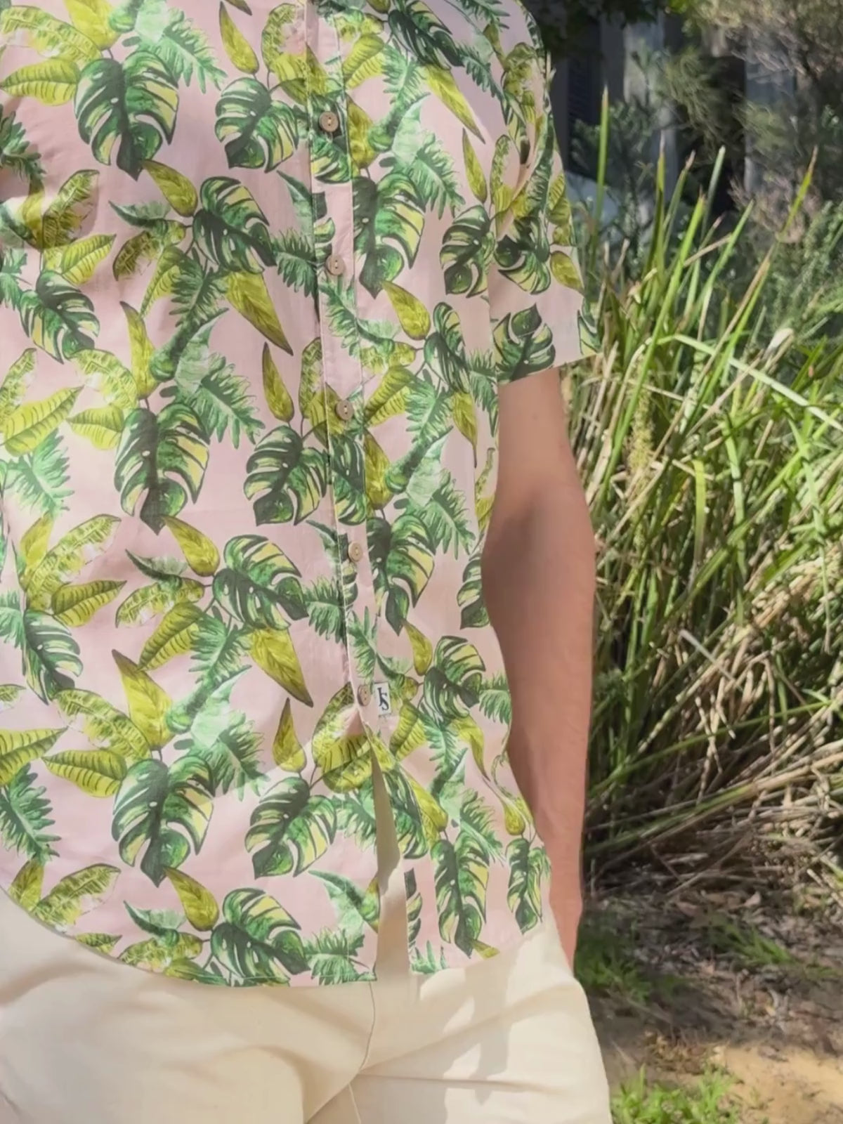 Tropical print reminiscent of a rainforest retreat in glorious greens tamed with a natural background.