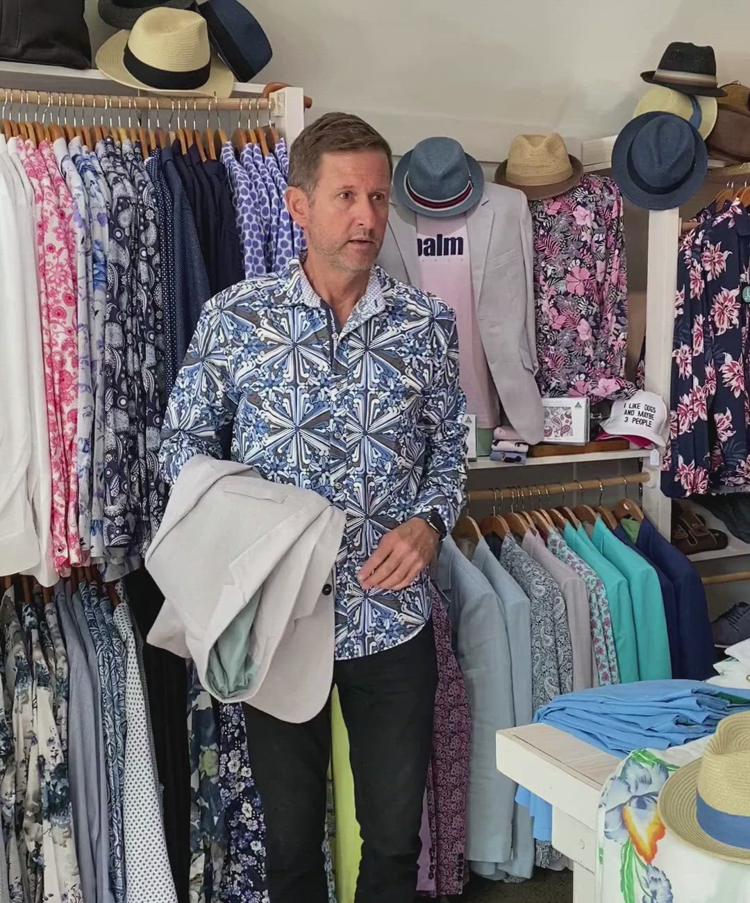 Mesmerising and hypnotic geometric modern paisley in cool blues with a dash of earthy brown and taupe. Australian Made Long Sleeve Shirt with Spread Collar. Trims and buttons may vary.